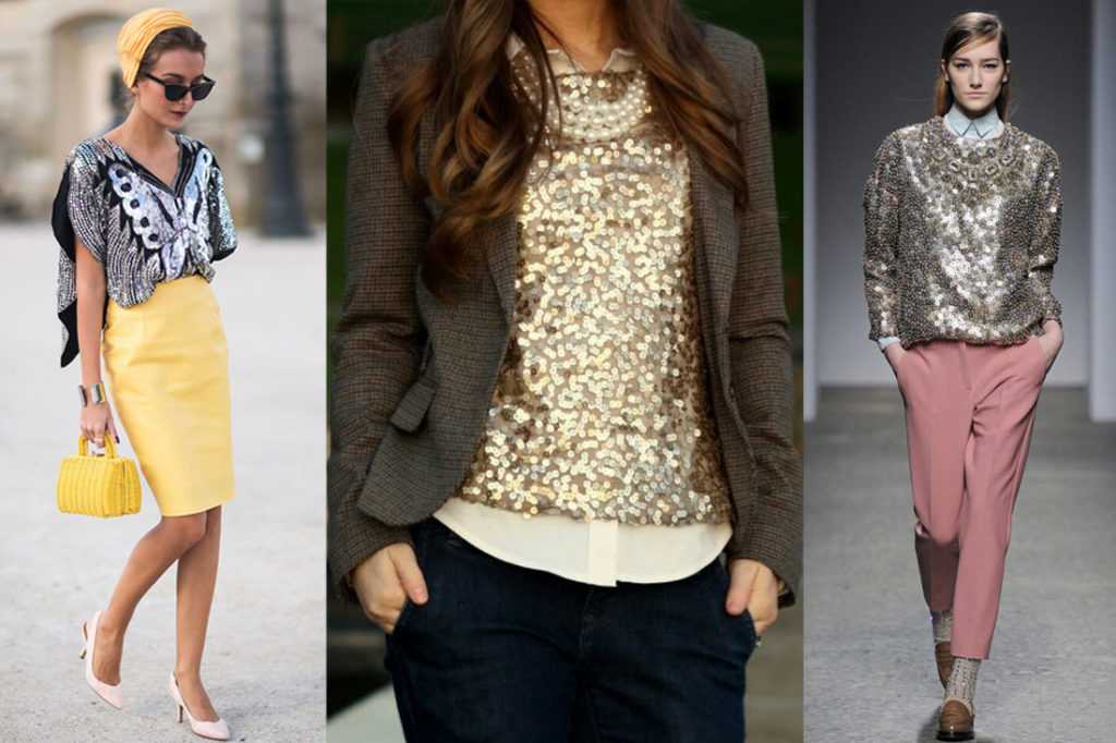Не стоит забывать о том, что блестки и переливающиеся топы (и одежда в целом) прибавляют несколько килограммов визуально, и поэтому позволить себе такую одежду может не каждая девушка. Если Вы и так склонны к полноте, то стоит задуматься над тем, а нужно ли Вам это подчеркивать. Если Вы полненькая, но очень любите блестки — приобретайте блестящие аксессуары и делайте акцент на них.