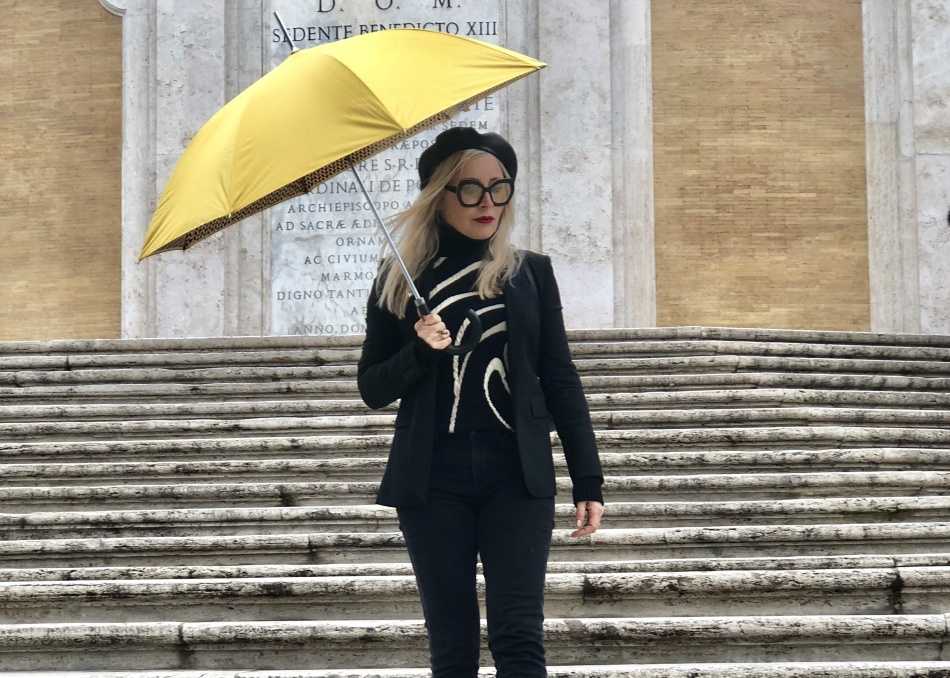 Модный лук с желтым зонтом