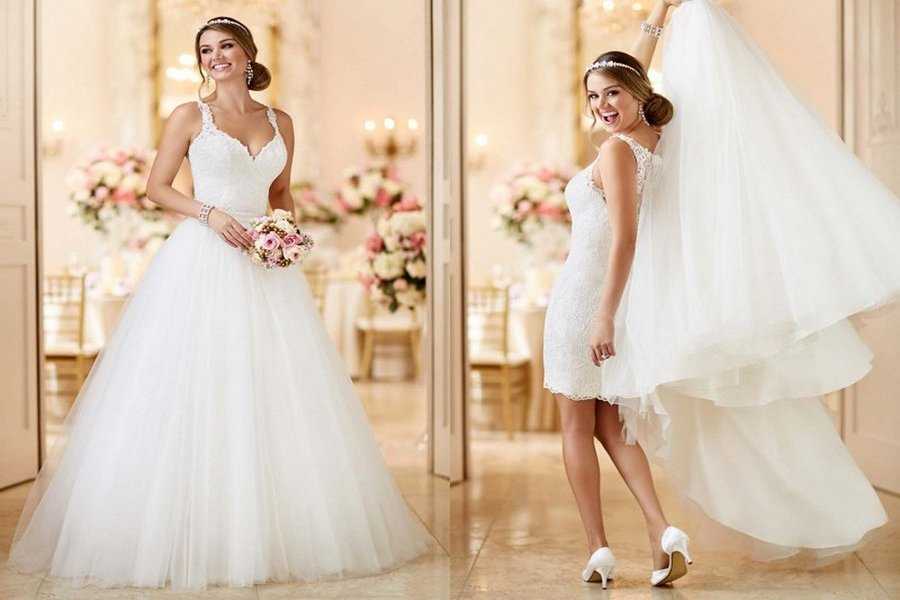 Достаточно интересное решение для активных невест, любящих комфорт и удобство. Ведь юбку до пят можно надеть на официальную часть в ЗАГС или венчание, если таковое планируется, а на банкете показать всем свои стройные ножки и вдоволь потанцевать, сняв одним движением руки длинный подол.