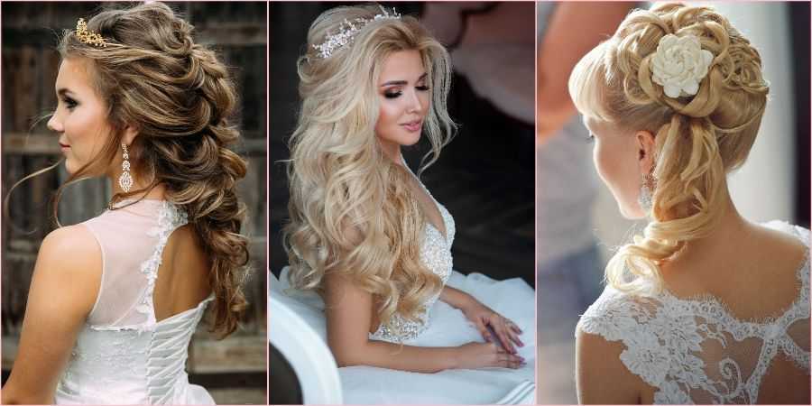 К пышному фасону уместно сделать красивую эффектную свадебную укладку, например: