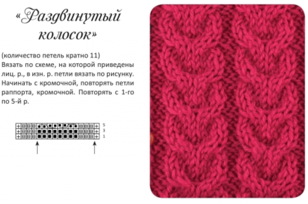 1-й р.: кромоч., 58 п. изнаночных, кромоч. 2-й р.: кром., 58 лицевых, кромочн. З-й р.: кромоч., 38 изнаночных п.,16 п. узора “колосок”, 4 изн. п., кромоч.