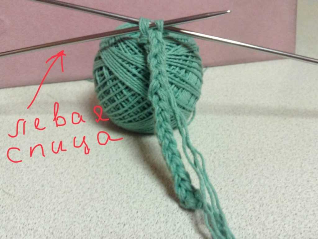 - 1-й. р.: кромоч., 3 изн., 8 лиц., 3 изн, кромоч. не провязываем – просто переносим на левую спицу.