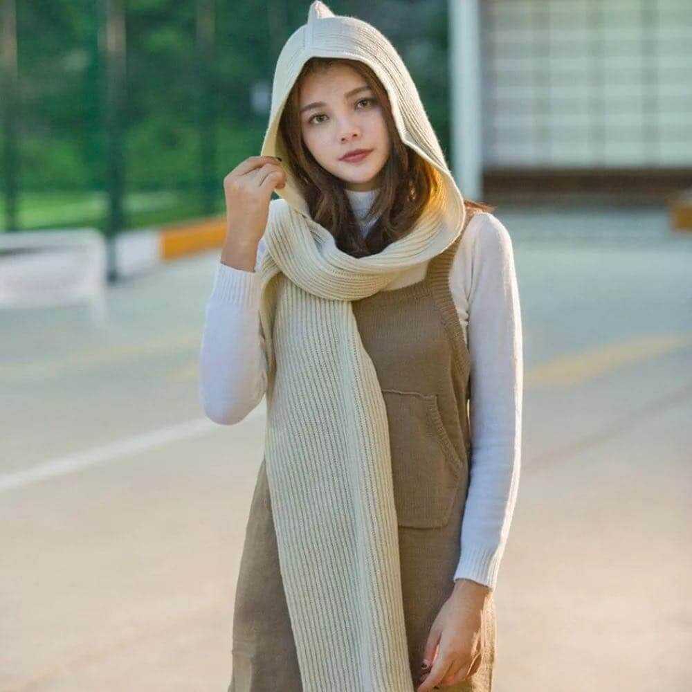Это довольно необычная модель: в длинном шарфе существует специальный капюшон.