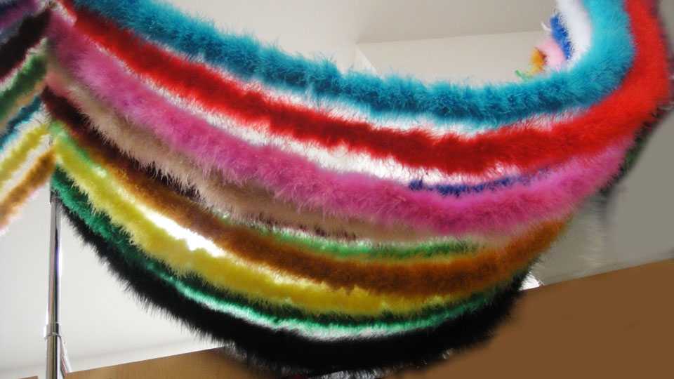 Занятно, что конструктивные особенности боа являются довольно простыми и даже в чем – то банальными. Перья и меха, окрашенные в разные цвета, попросту склеиваются между собой и скрепляются слоями.