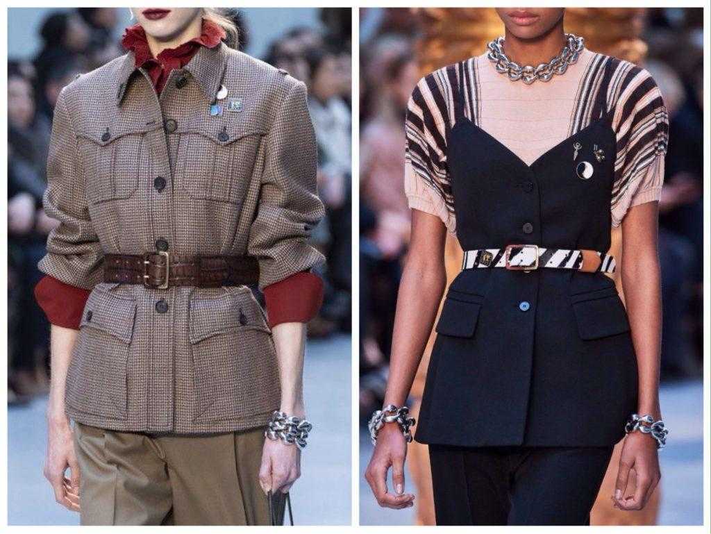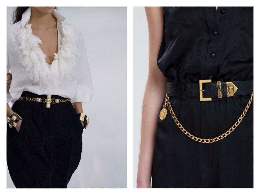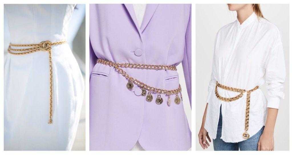 Пояс цепочка выглядят интересно. Некоторые модные блогеры уже предложили носить их на поясе сразу по несколько штук. Их надевают поверх платья или продевают в шлейки брюк, юбок, джинс, как в коллекциях Chanel, Marni или Marine Serre.