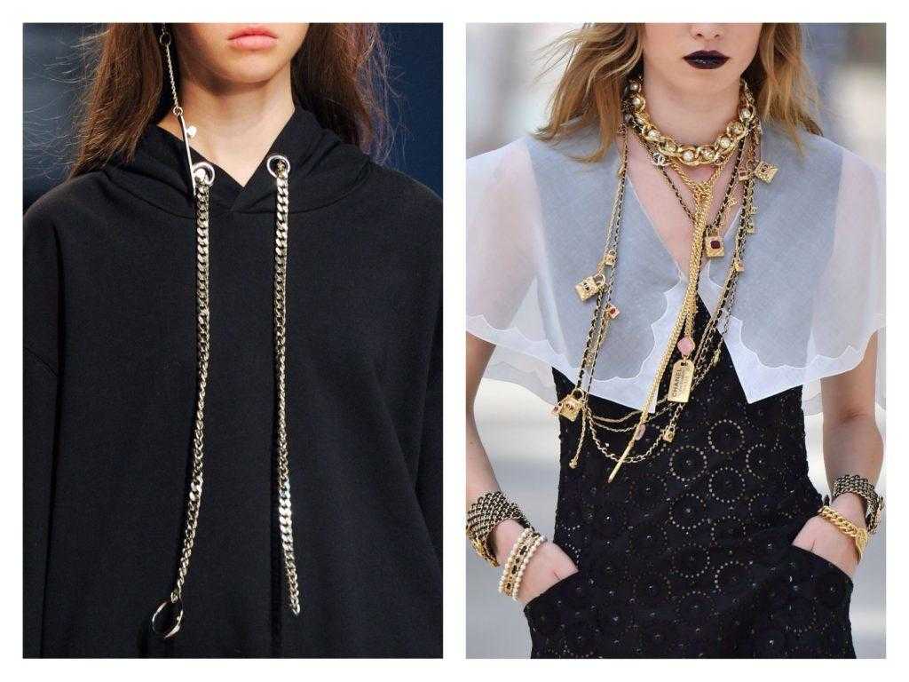 Массивная цепь. Наряду с объемными вариантами, дизайнеры представили изделия в стиле гранж и индастриал. Вначале кажется, что на девушке изделие из строительного магазина. Но, самыми популярными стали переплетающиеся цепочки.