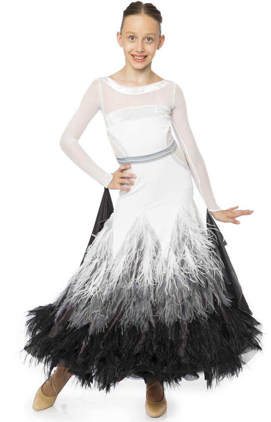 А вот в конкурсных программах есть жесткие стандарты и ограничения. Разрешено сочетать несколько 2-3 вида материалов, использовать одно или два украшения в виде заколки на волосах, броши с пером, сережки. Иногда уместно дополнить подол маленьким шлейфом.