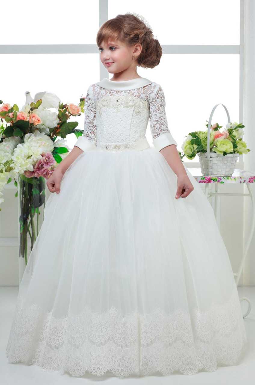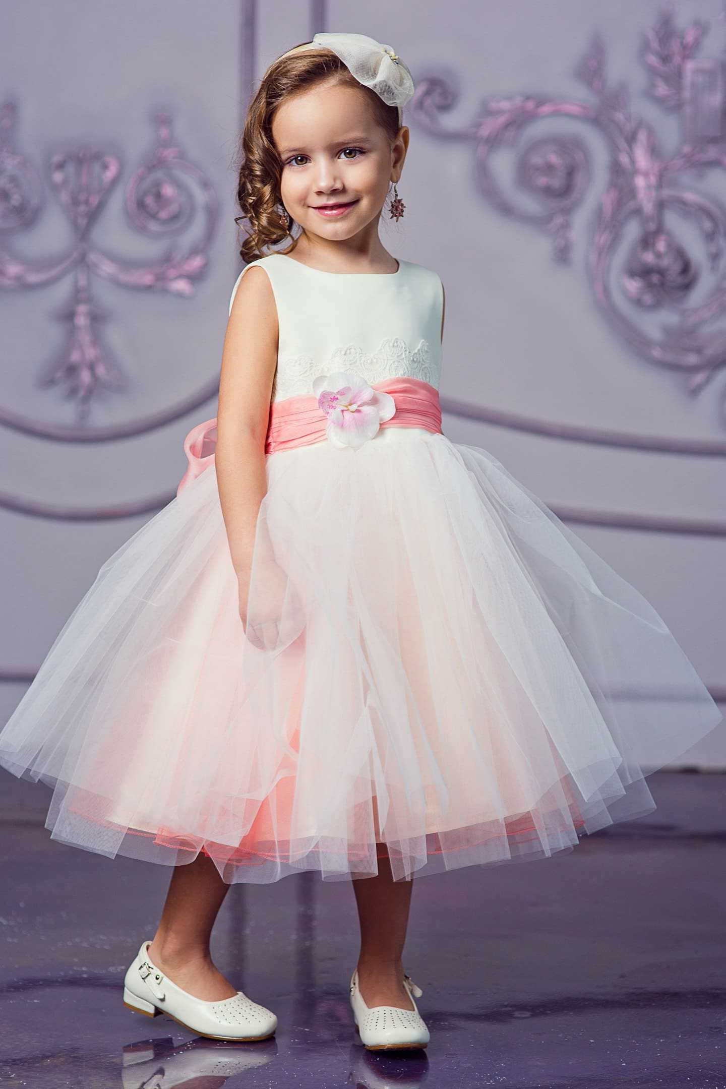 Очаровательное платье с белым топом и многослойной фатиновой юбкой жемчужно-персикового цвета – прекрасное решение для летнего праздника на свежем воздухе или в кафе. Асимметричный крой юбки позволит выглядеть оригинально и стильно и не будет мешать активным играм и танцам. Более нарядным ансамбль можно сделать, расшив лиф пайетками или бисером. Заключительным акцентом послужит роскошный цветок из фатина, украшающий прическу юной красавицы.