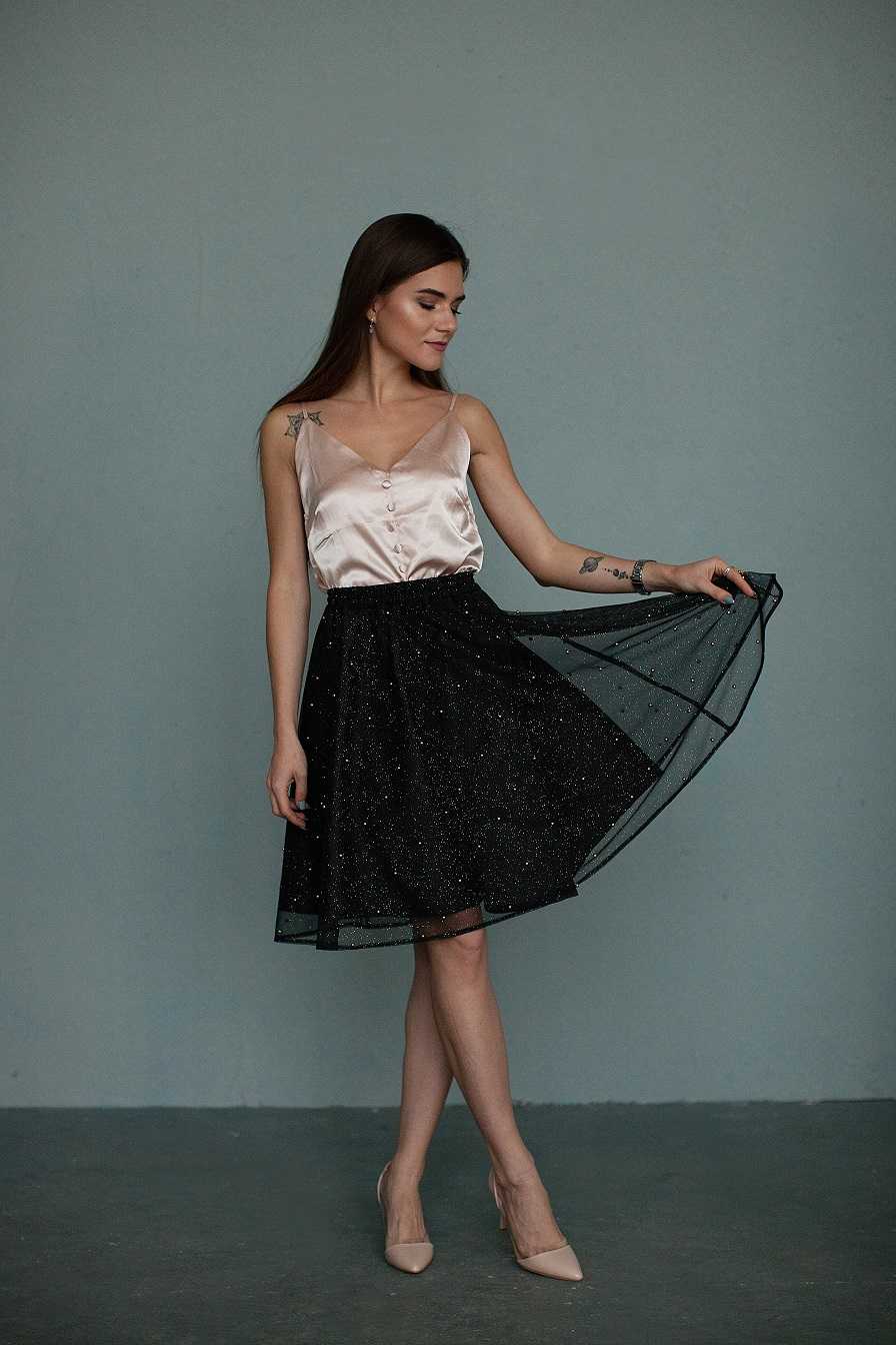 Легкий, гладкий материал, из которого чаще шьют праздничные изделия. От его жесткости зависит объемность юбки. Сочетать его можно с разными блузками и топами. Недостатки фатина: сильно электризуется, может деформироваться при нахождении рядом с обогревательными приборами.