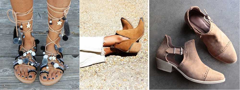 С обувью всё просто. Летом носите разноцветные тканевые и кожаные сандалии натуральных оттенков, а в более прохладное время замшевые коричневые ботильоны и ковбойские сапоги. Конечно, такое разделение условно. На любом зарубежном музыкальном фестивале (а именно они стали меккой бохо-стиля) вы обнаружите, что каждая вторая девушка комфортно себя чувствует в сапогах с широким голенищем в 30-градусную жару.