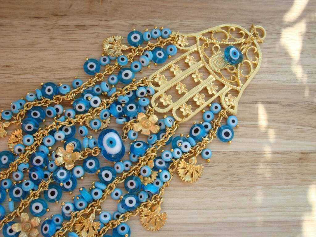 - бусина в виде синего глаза (продаётся в магазинах для рукоделия) или металлическая подвеска в виде человеческой руки под названием хамсу.