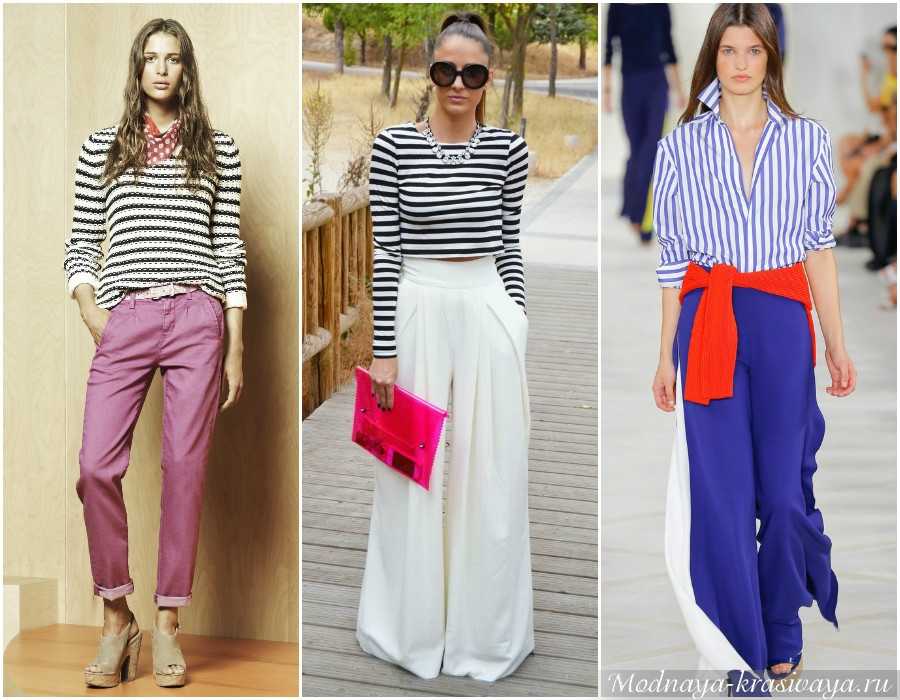 Брюки прямого кроя. Прямые хлопковые брюки – беспроигрышный вариант для летнего сезона. Легкие брюки из хлопка являются хорошей альтернативой джинсам при создании летнего образа в морском стиле. Брюки могут быть любого цвета – красного, синего, белого или бежевого.