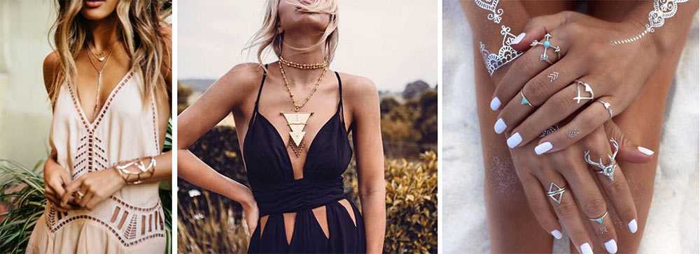 Основное внимание в стиле бохо уделяется украшениям. Их должно быть чрезмерно много и они должны выделяться фактурой, объемностью и заявлять о себе еще до того, как кто-то успеет рассмотреть вашу одежду