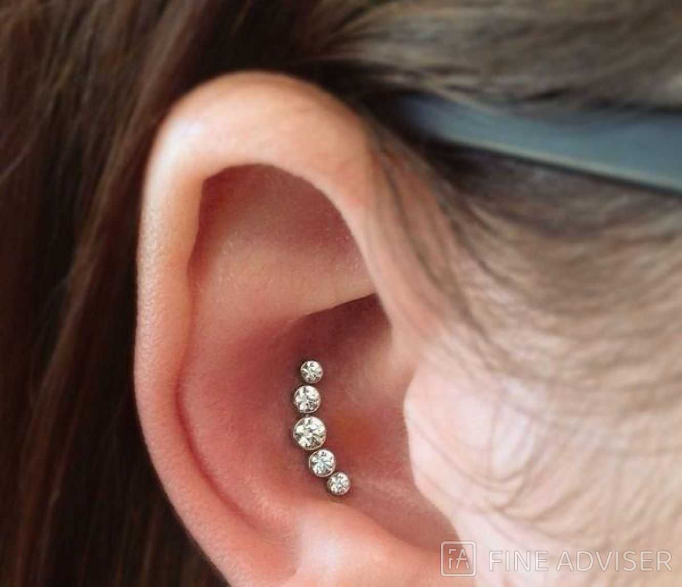 Прокалывается верхняя часть ушного хряща. Сразу в ухо вставляют прямую сережку-лабрет с накруткой, которую потом заменяют на более короткую. Красиво смотрятся в проколах helix украшения с несколькими камнями.