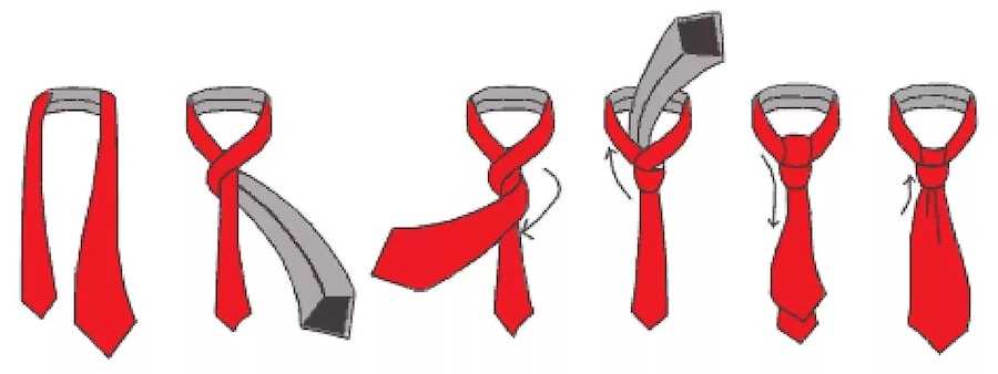 1. Галстук кладётся на плечи швом внутрь, узкая половина справа, широкая слева. 2. Затем широкая половина перекрещивается под узкой в правую сторону (шаг 1). 3. Чуть выше места перекрещивания у широкой половины галстука сверху делается загиб, чтобы изнанка оказалась наружу (шаг 2). 4. Эта самая отогнутая часть широкой половины закладывается перед висящей узкой половиной галстука (шаг 3). 5. В образовавшееся «кольцо» на шее движением снизу вверх продевается широкая половина (шаг 4). 6. Пальцами делается более свободным узел на узкой половине галстука, и в него же пропускается широкая половина (шаг 5).