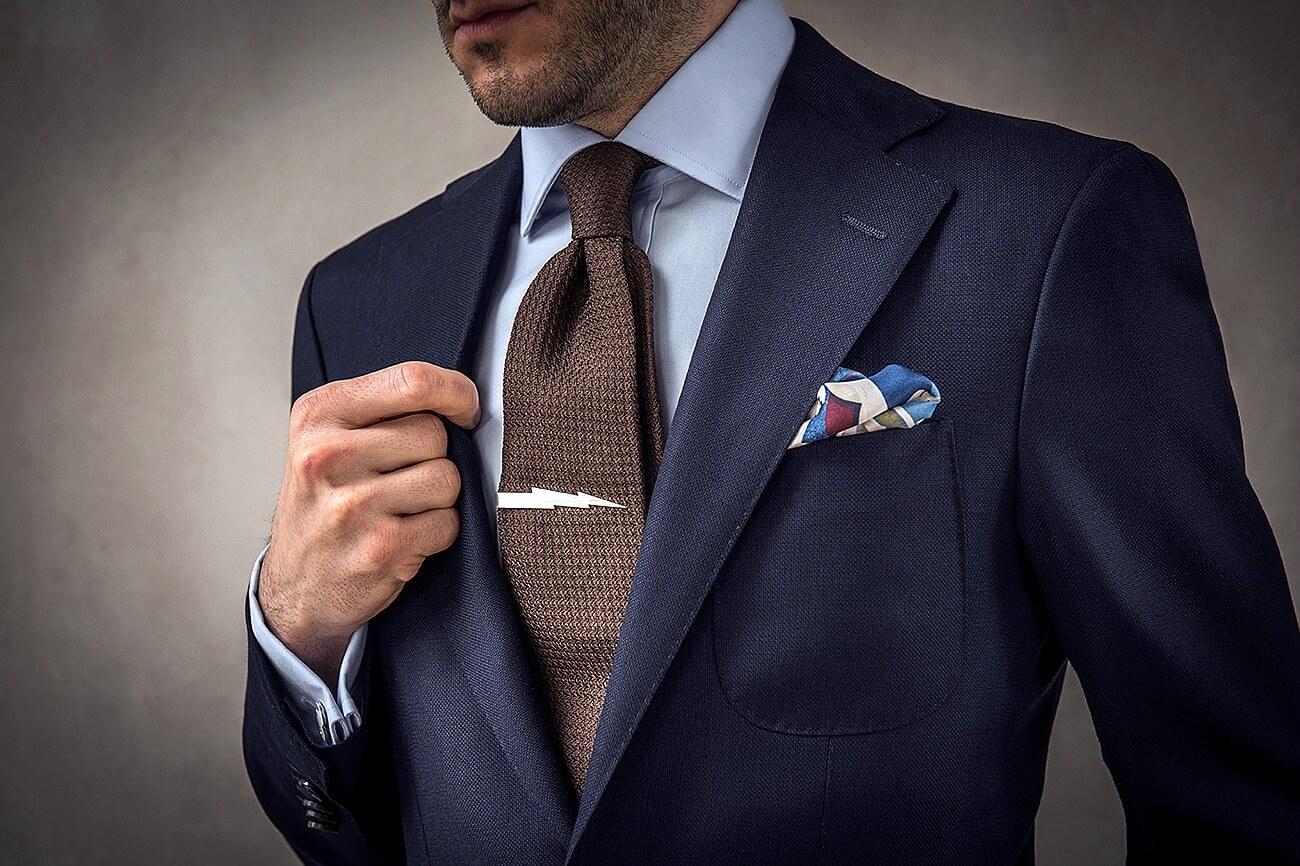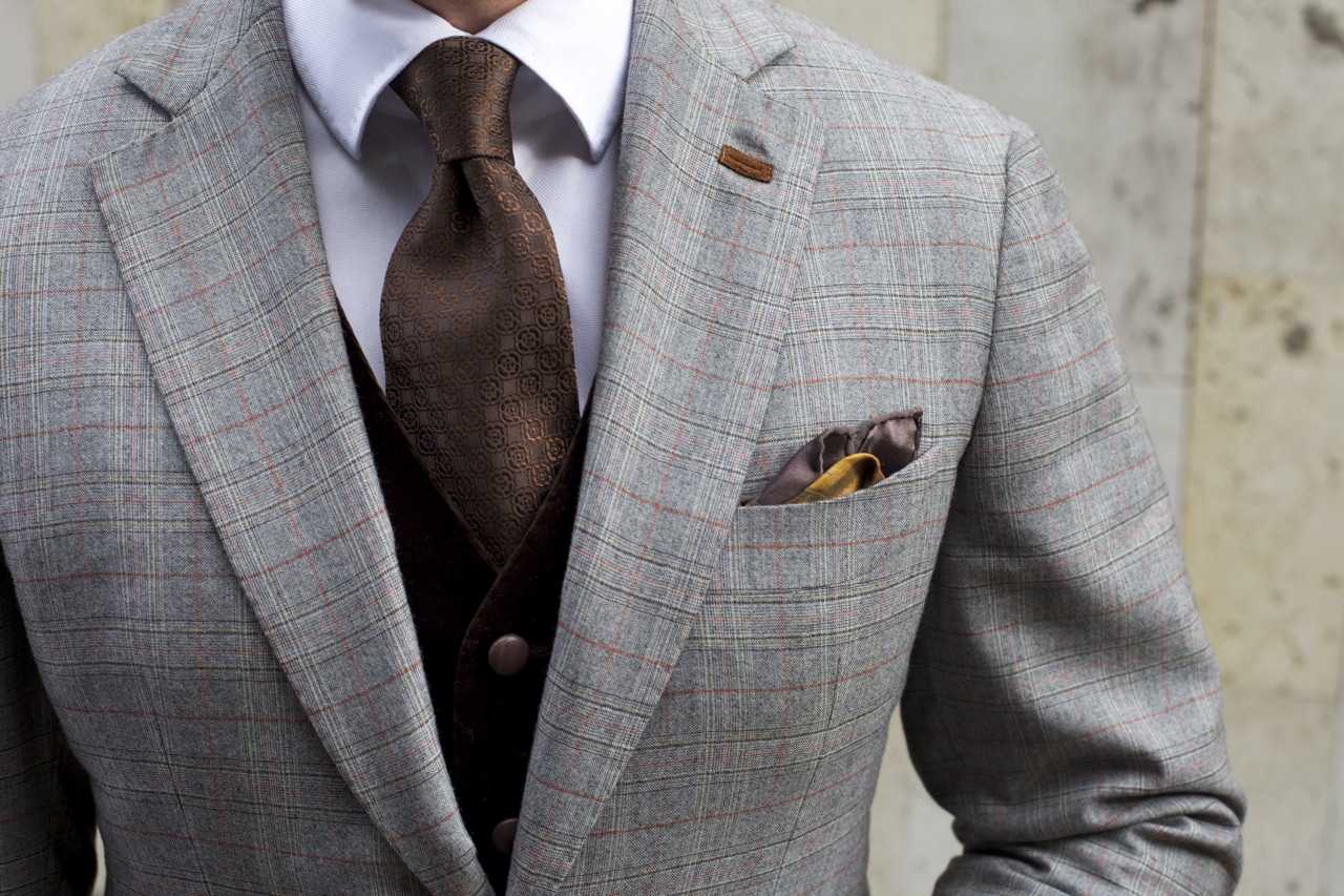 При выборе яркой детали гардероба отдавайте предпочтение тяжелым, увесистым аксессуарам, которые состоят из шести-семи слоев шелка, трех полосок с внутренней вставкой из драпированной ткани, обернутой шерстяным или атласным полотном. Чтобы узел был выпуклым, поддерживал объем, широкую форму, необходимо покупать многослойные шейные элементы костюма. Галстук рыхлой структуры шьют из гренадина – шелка особого плетения. С пиджаком из твида отлично сочетаются с набивным рисунком из натуральных красителей на гуммиарабиковый шелк. Полоска на ткани, идущая от правого плеча к левому – американский деловой формат отлично выглядит с костюмом в елочку или однотонным цветным блейзером.