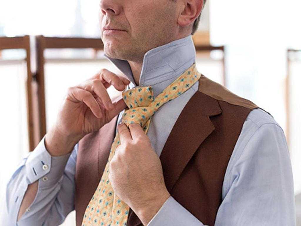 - Галстук накладывают над воротником, причем суженная его часть должна быть на 25 см короче.