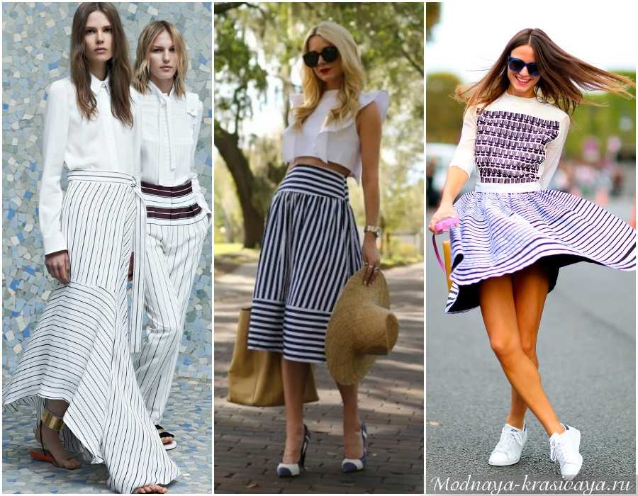 Модель с полосатым лифом, выполненным в сине-белом цвете, и однотонная синяя юбка облегающего кроя подчеркнет изящество фигуры своей обладательницы.