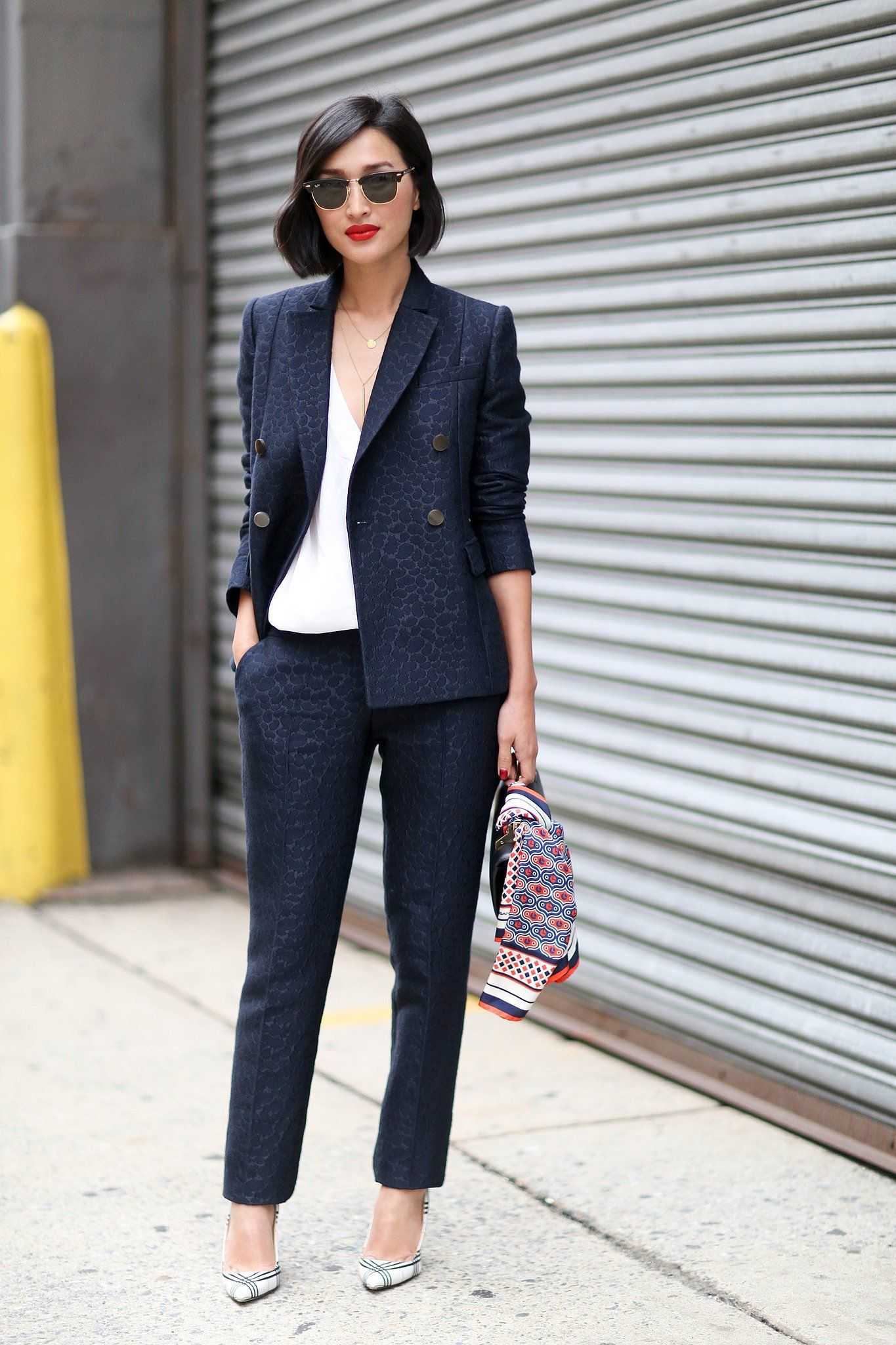Блуза может украшаться изящным узором, а сама костюмная ткань — диагональной клеткой или полосками. Эти нюансы также соответствуют классическому офисному стилю.