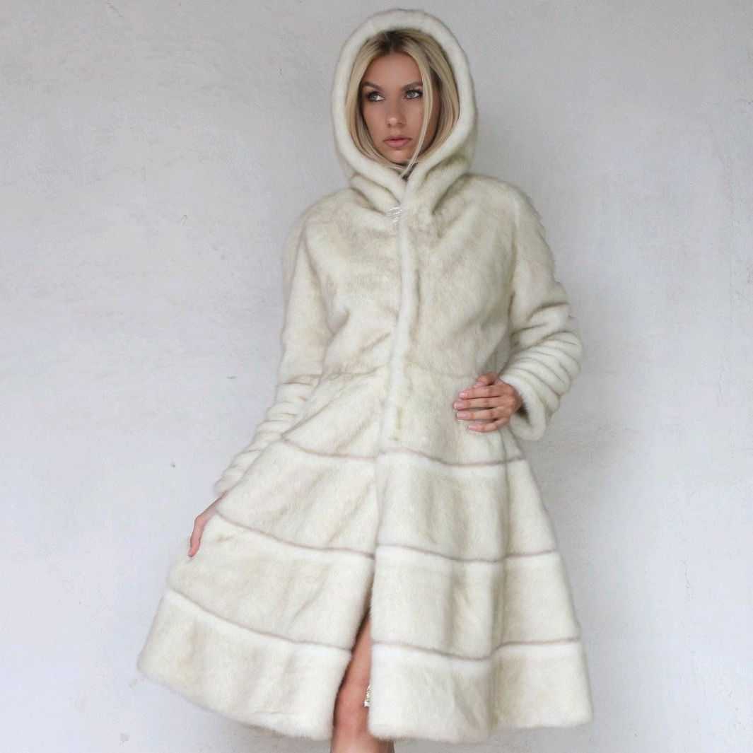 Белая норковая шуба-поперечка и модели с капюшоном