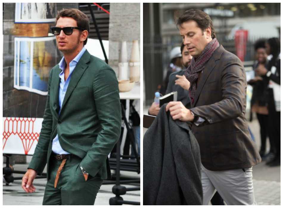 Мужские костюмы уже давно перестали быть одеждой для официальных случаев. Не обязательно это должны быть пастельные, темные или светлые тона. Streetstyle допускает сочетание брюк и пиджака разных цветов, броские цвета, интересные аксессуары в виде необычных шарфов, галстуков и прочих элементов.