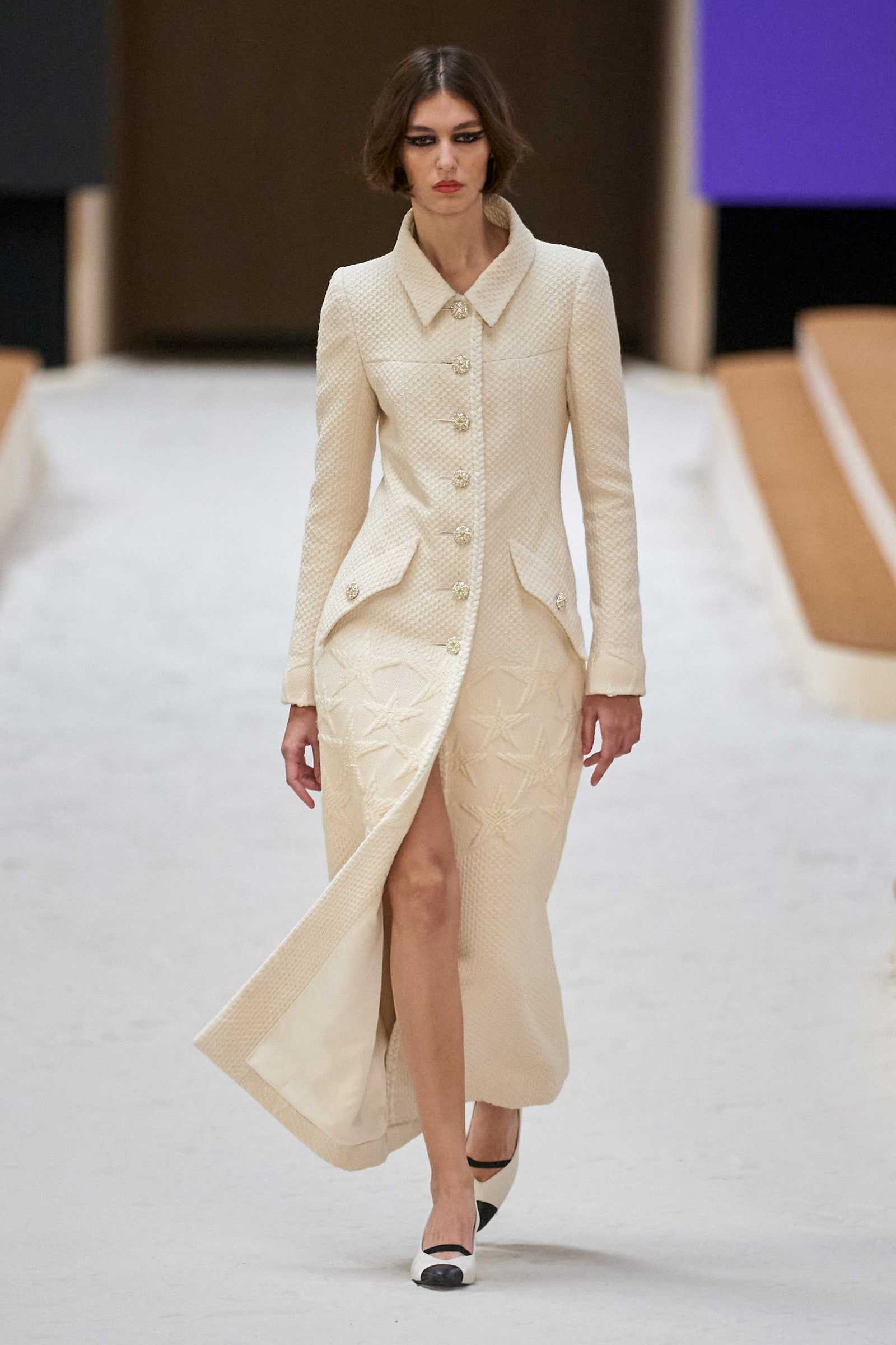 Среди моделей со сложным фасоном можно отметить белые пальто с большим и двухъярусным отложным воротником и строчками, косыми карманами и кокеткой. Пальто приталенного силуэта длиной чуть выше колена. Украшают модель крупные пуговицы и широкий черный пояс.
