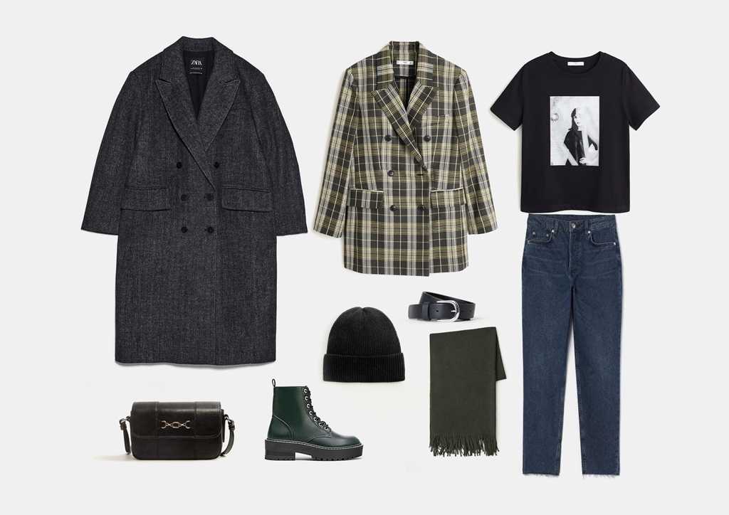 За основу возьмем простые джинсы mom fit, добавим футболку с принтом и пиджак в клетку. Дополним получившийся комплект аксессуарами: темно-серой шапкой бини, шарфом и сумкой кросс-боди