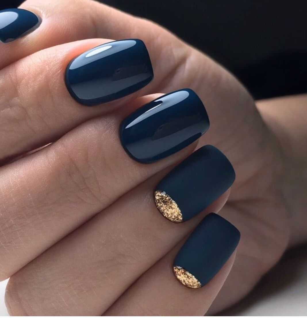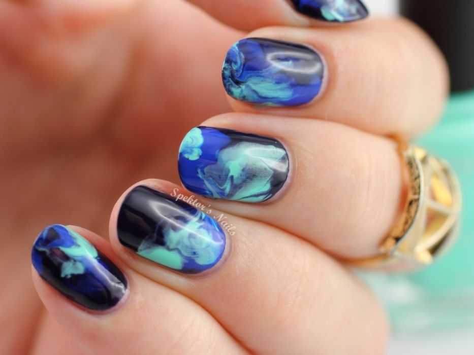 Сочетание синей и черной краски получается очень эффектно и эффектно. Лучшие дизайны для этой пары — омбре и простыня.