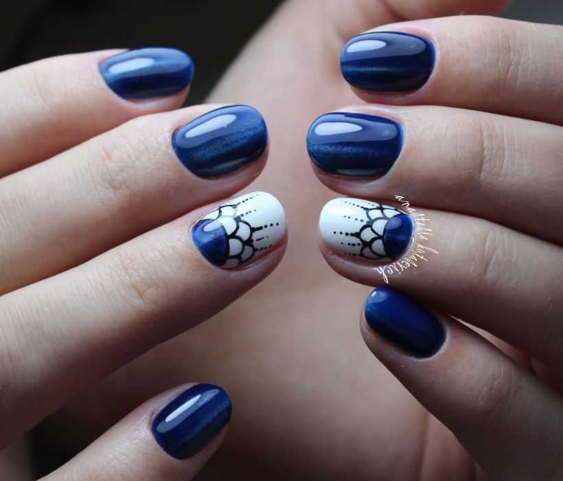 Многие идеи синего маникюра также рождаются при сочетании разных лаков.Синий с белым — легкость и свежесть. В любом варианте: френч, градиент, графика или морилка.