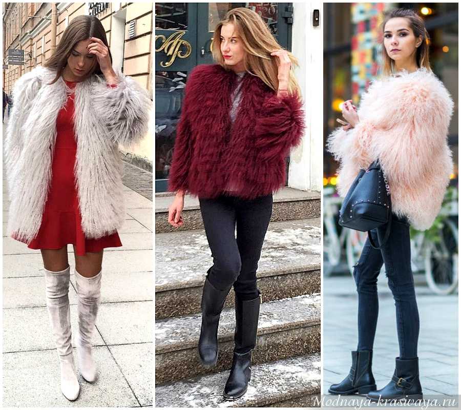 Любительницам сапог с высоким голенищем пушистая шубка подойдет лучше всего. Также меховые изделия хорошо сочетаются с обувью на плоской подошве. Один из стильных образов последних сезонов – полушубок с рукавами три четверти, высокими сапогами, длинными перчатками и стильным кожаным поясом. А вот от шпилек лучше отказаться. Они плохо сочетаются с объемными шубами, лук получится вульгарным, дешёвым, безвкусным.