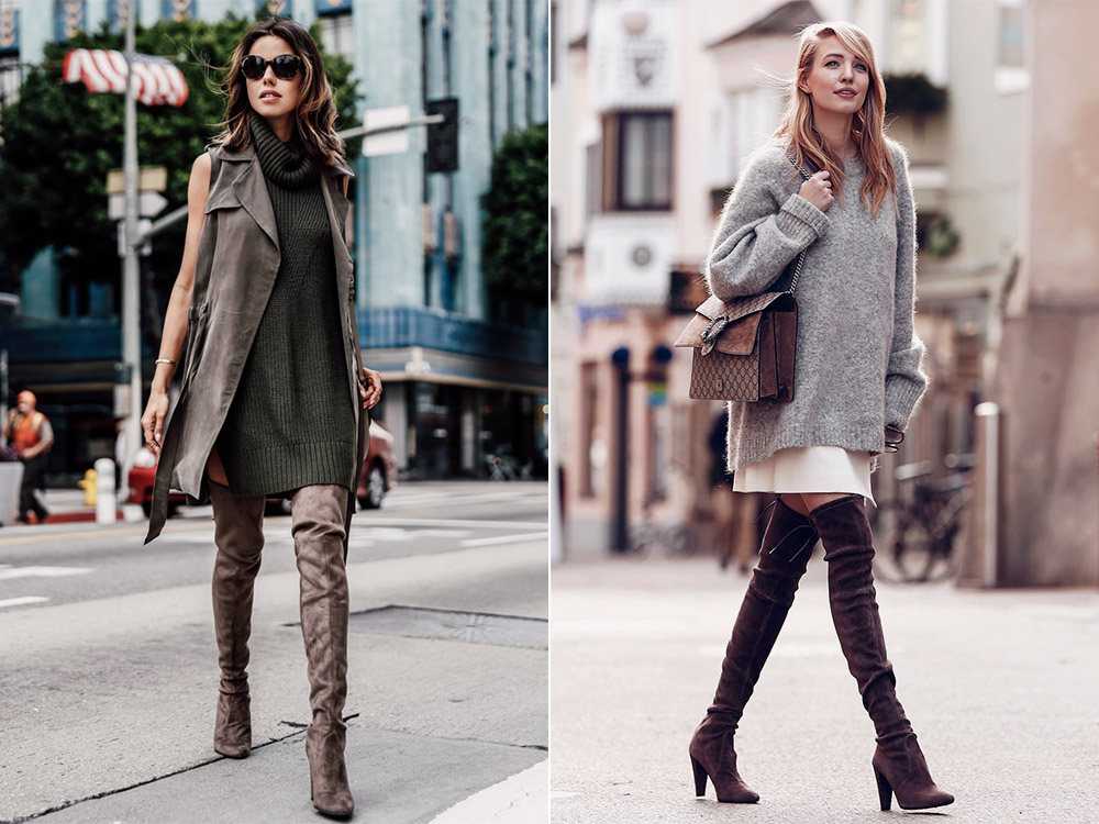 Первое, на что следует обратить при подборе одежды, так это на цвет и высоту голенища. К примеру, коричневые, болотные, горчичные и бежевые модели будут прекрасными напарниками вязаным платьям и туникам, кожаным юбкам, леггинсам и удлиненным свитерам в смежных оттенках.