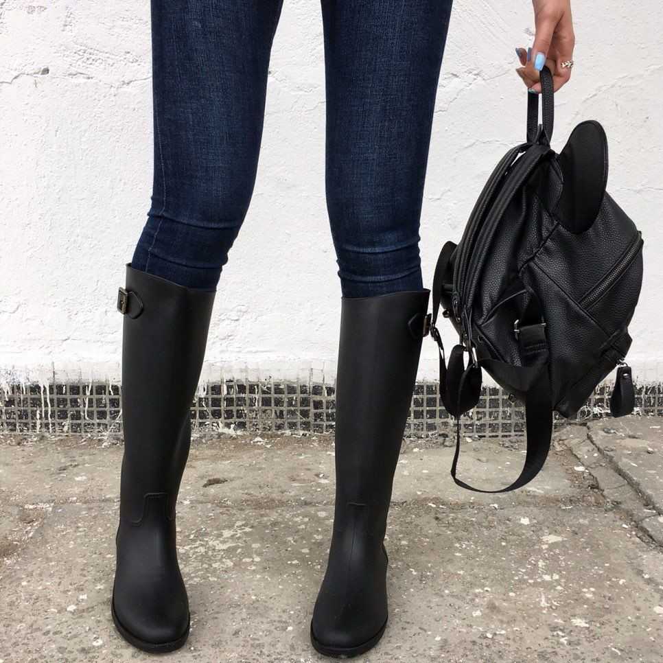 - Резиновые. Узкие джинсы, парка, теплый свитер и вязаная шапочка — наилучшие спутники таких сапог.