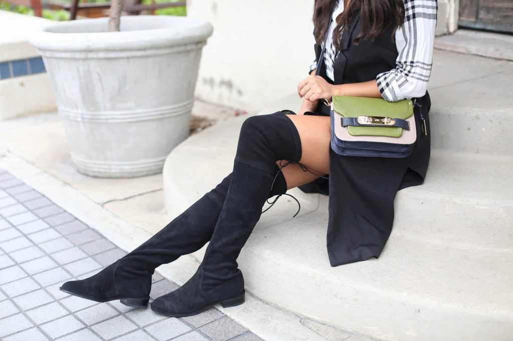 - высокие сапоги – сами по себе акцент, а значит сумочка и украшения должны быть минималистичными. Декольте, неоновый макияж, аксессуары вроде массивной и блестящей бижутерии «уронят» образ до позиций девушки по вызову.