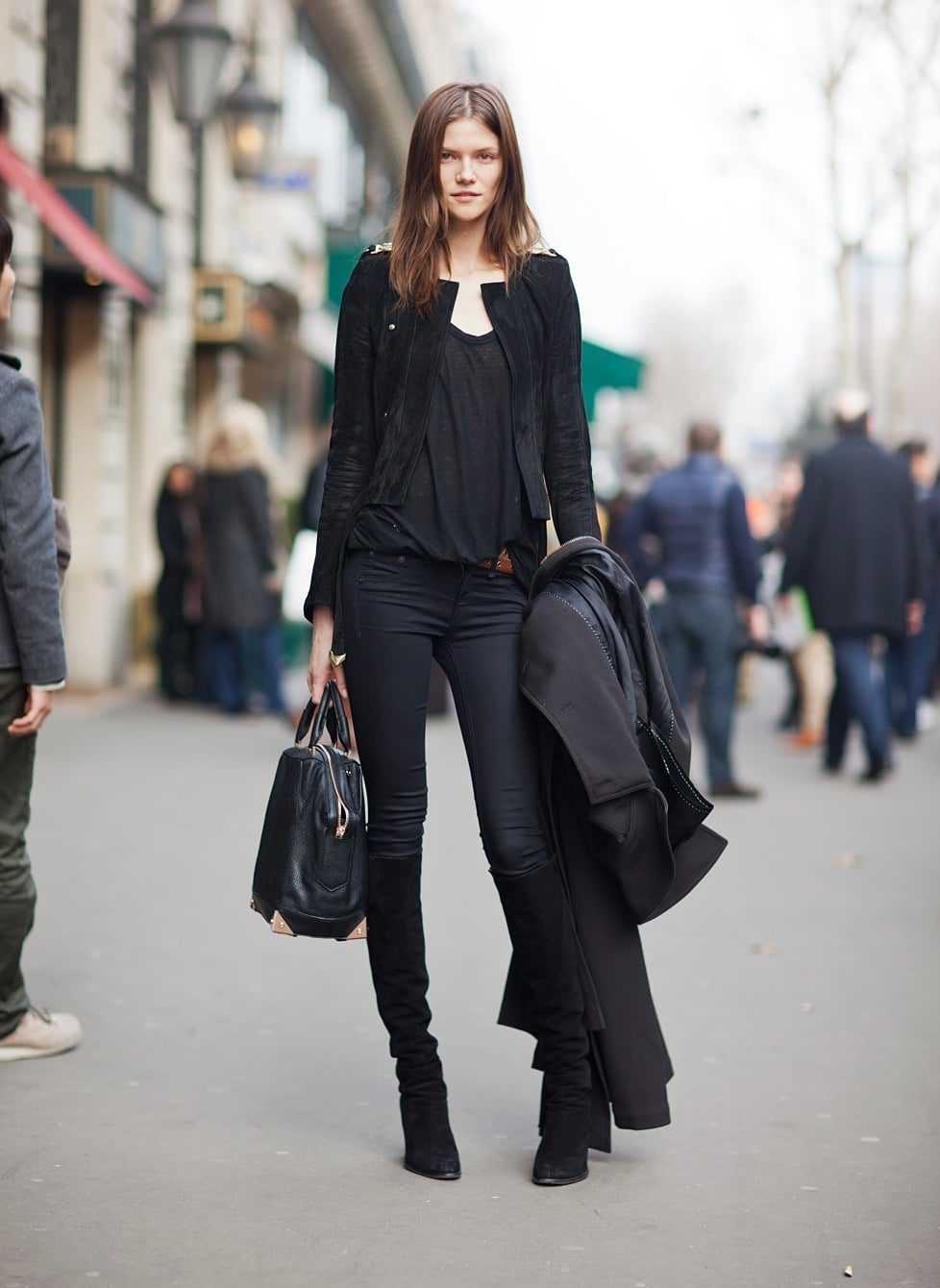 Под чёрные классические модели подойдут синие или серые штаны. Наверх смело можно надеть топ или лёгкий приталенный свитер/джемпер. С серыми облегающими джинсами отлично смотрятся завышенные чёрные сапоги на большом устойчивом каблуке. На верх надеваем классический жакет тёмных тонов и майку, топ.
