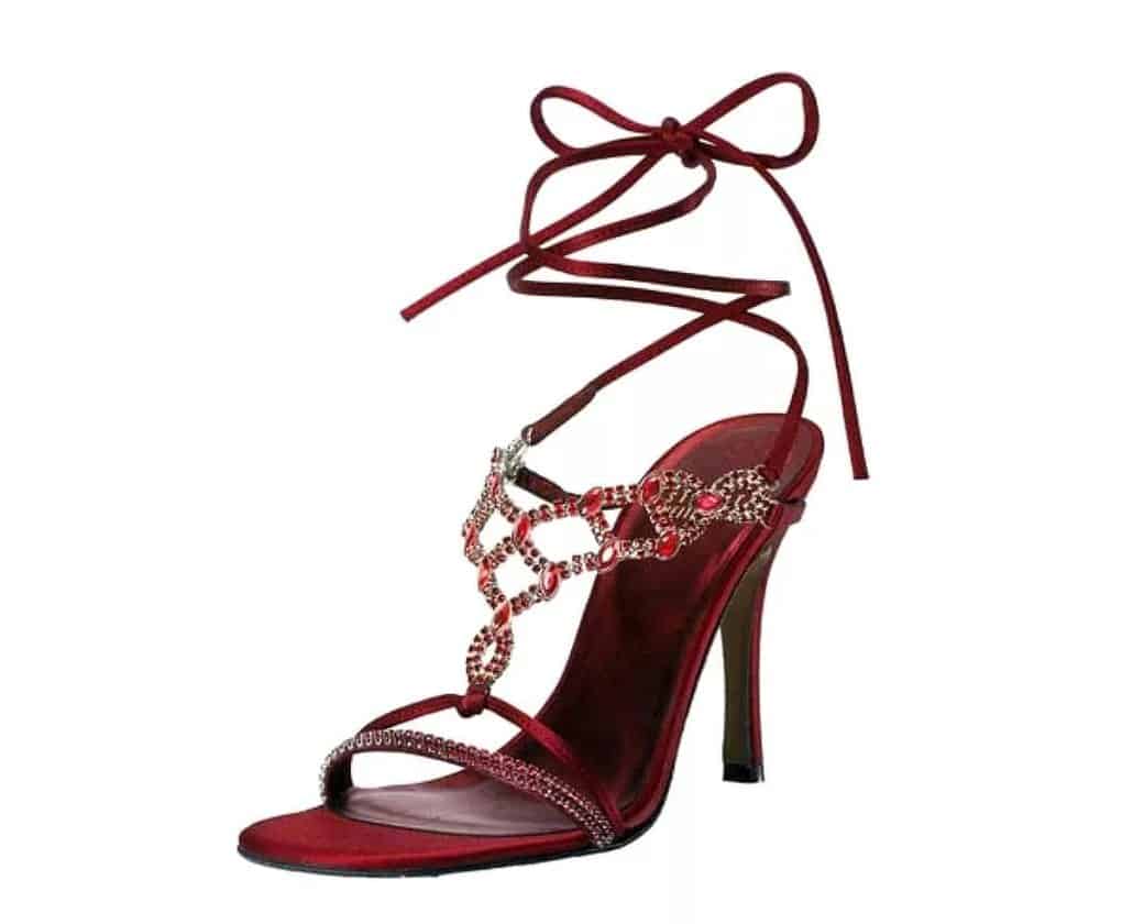 Каждая женщина была бы в неописуемом восторге от такой модели – босоножки обтянуты красной атласной лентой, в которую вставлена платина.