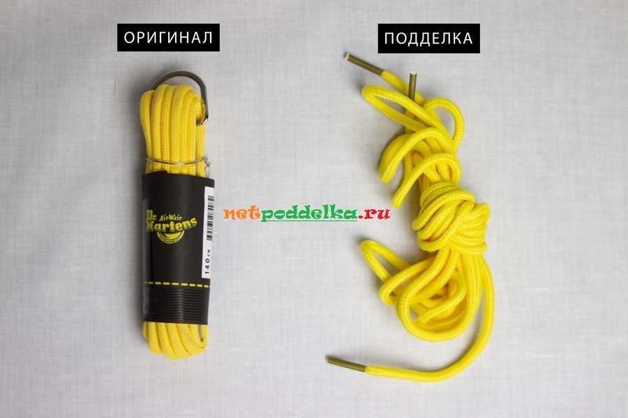 Раннее фирменная обувь Dr. Martens комплектовалась запасными желтыми шнурками. Они были уложены в пакетик с логотипом. Сейчас дополнительные шнурки встречаются лишь у некоторых моделей. Они аккуратно укладываются в обертку с логотипом. Если же запасные шнурки просто лежат в коробке, то обувь однозначно поддельная.