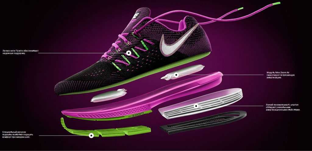 Подошвы обычно многослойные. Изготавливаются из резины и синтетических материалов. Добавляются слои с микропорами — это делает обувь легкой.