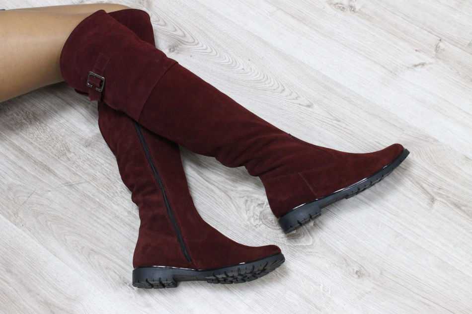 Зимние замшевые ботфорты на низком ходу нередко производятся в конфигурации еврозима, с утеплением до щиколотки. За счет отсутствия меха в верхней части сапог облегает ногу, выгодно подчеркивая контур.
