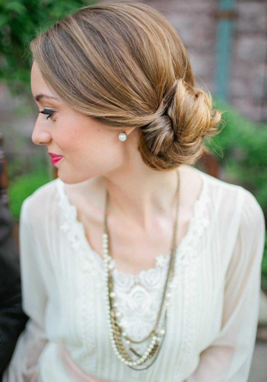 Элегантно смотрится коса, начинающаяся от виска и сплетенная в пучке в виде улитки. Есть много вариантов оформления подобной укладки.