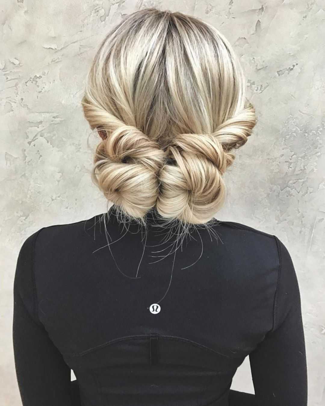 Красиво будут выглядеть два пучка с выпущенными прядками волос у лица.