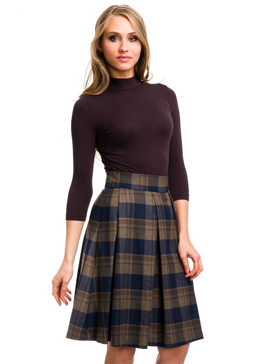 Напоминанием о прошлом служит юбка-полусолнце в клетку. Она позволит создать образ в стиле ретро. Многие женщины, которые решились на данный элемент гардероба, отдали предпочтение длине до колена. По их мнению, это позволит получить винтажный образ.