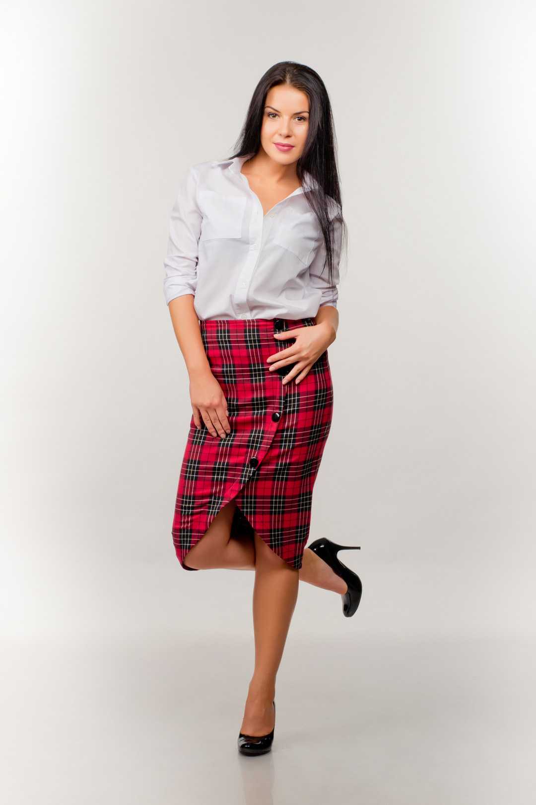 Стильная красно-черная клетка – это простой способ придать своему образу яркости. Такой вариант подойдет молодым девушкам, которые могут использовать юбку в красную клетку при подборе нарядов для работы или учебы. Чтобы юбка смотрелась более эффектно, дополните ее алыми туфельками или ботильонами на тонком каблуке.