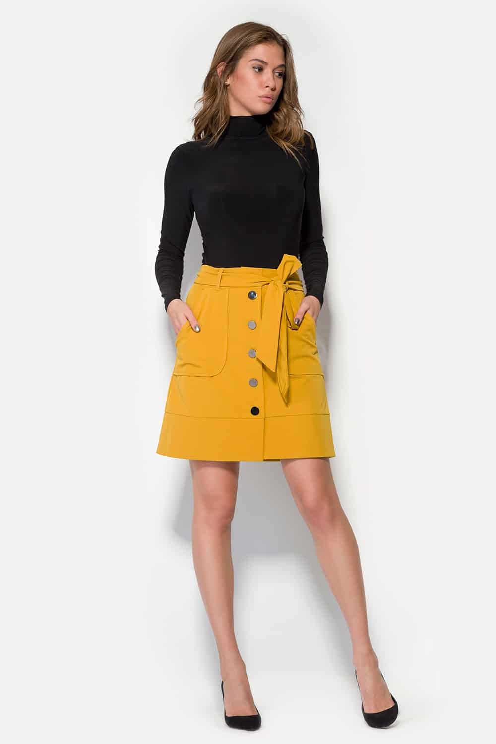 Не менее стильно выглядит юбка-трапеция с пуговицами по центру. С одной стороны, это обыденный наряд, с другой стороны – очень милое и элегантное изделие. Чем больше пуговиц, тем экстравагантнее наряд. Можно декорировать образец пуговицами, расположенными на передней планке или карманах, это только добавит шарм и изысканность изделию. Короткую модель лучше украсить минимальным числом пуговиц, а миди и макси требуют значительного числа декоративных элементов.