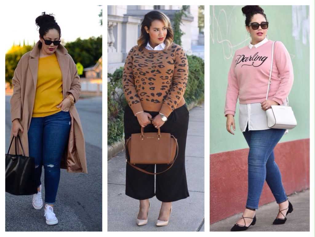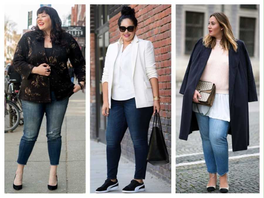 Самые оптимальные ансамбли для полных девушек – многослойные, в стиле street casual. Например, такой лук, как на фото в центре. Узкие джинсы дополненные футболкой с асимметричным низом и блейзером оптимальной длины.