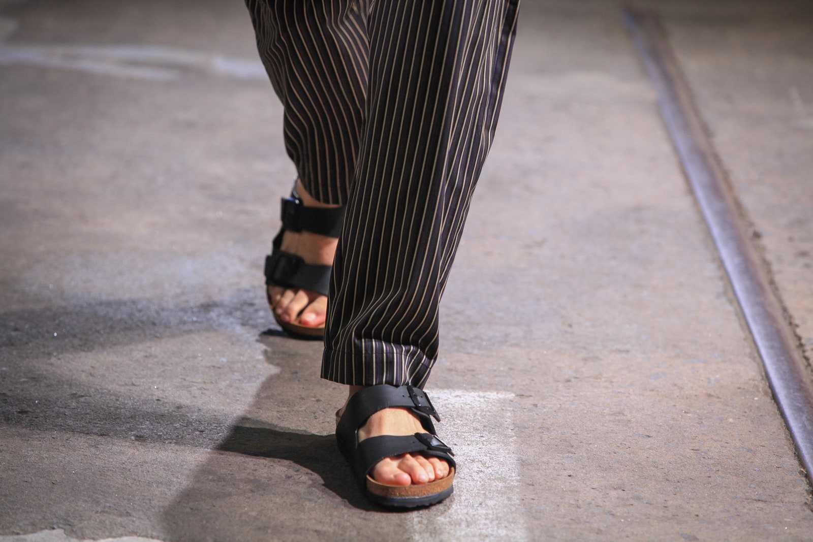 Модель в сандалиях Arizona Birkenstock на показе Blair Archibald resort 2019