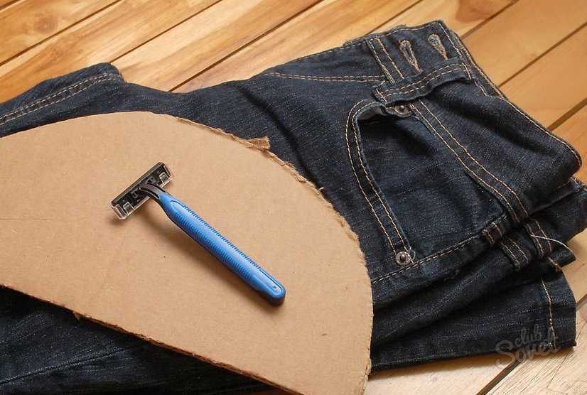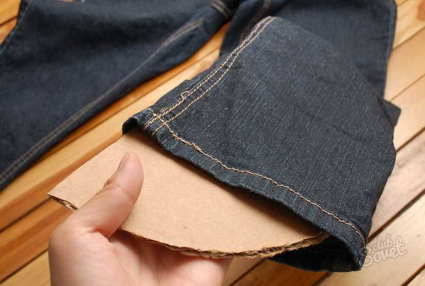 Обязательно также использовать дощечку, фанеру или плотный картон, согнутый в несколько слоев. Их нужно подкладывать внутрь штанины во время работ, чтобы не повредить заднюю сторону. Нельзя делать прорези, когда штаны надеты на человека.