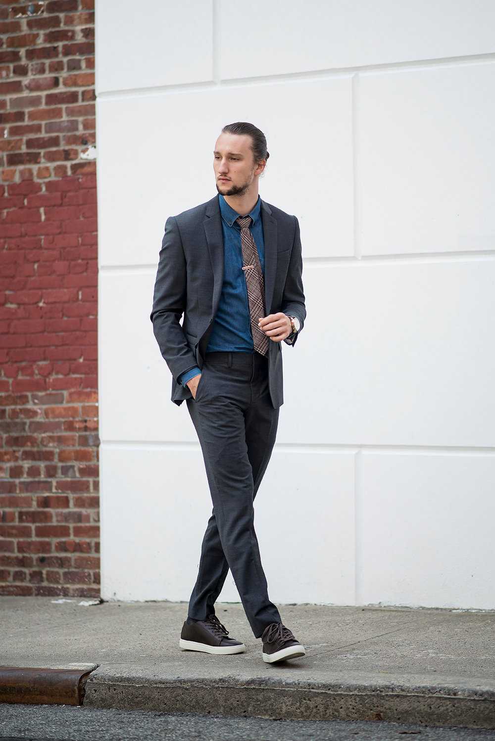 - Классические деловой пиджак и брюки с рубашкой, кеды яркой окраски на белой тонкой подошве со шнуровкой.