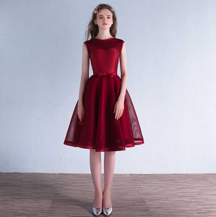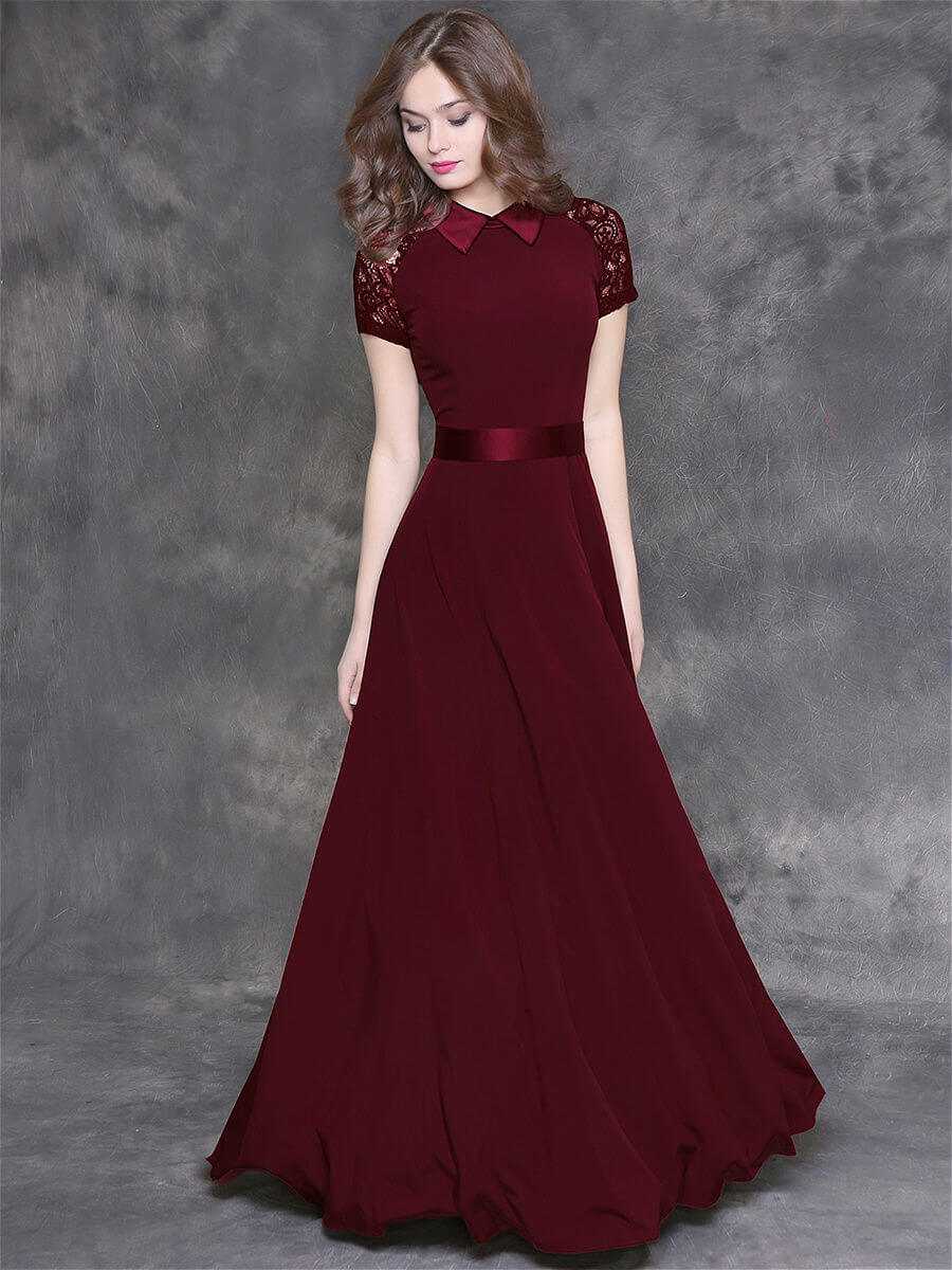 Цвет бордо – по-королевски роскошный, прекрасно оттеняющий кожу и превращающий юную красавицу в аристократку. Попробуйте примерить на себя образ светской львицы и наденьте платье длиной в пол, маленькими рукавами и аккуратным воротничком под горло – очень красиво! Гармонично смотрится и сочетание атласа, матовой ткани и фатина, использованное в платье длиной чуть ниже колен с линией отреза по талии и расклешенной юбкой. И туфельки в серебристом цвете тут пришлись очень даже к месту.