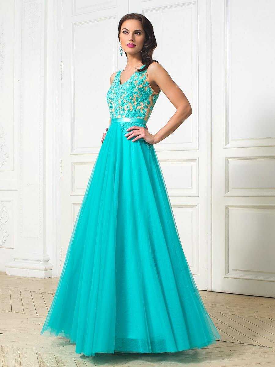 Еще один прекрасный цвет для нежного платья на выпускной 9 класса – голубой. Его можно использовать как в монохромном варианте, так и при создании контрастов. В первом случае образ будет смотреться цельным и самодостаточным, во втором – вы будете выглядеть экзотическим цветком, в котором сочетаются нежная пастель и насыщенный черный, пущенный по подолу и переходящий на лиф.