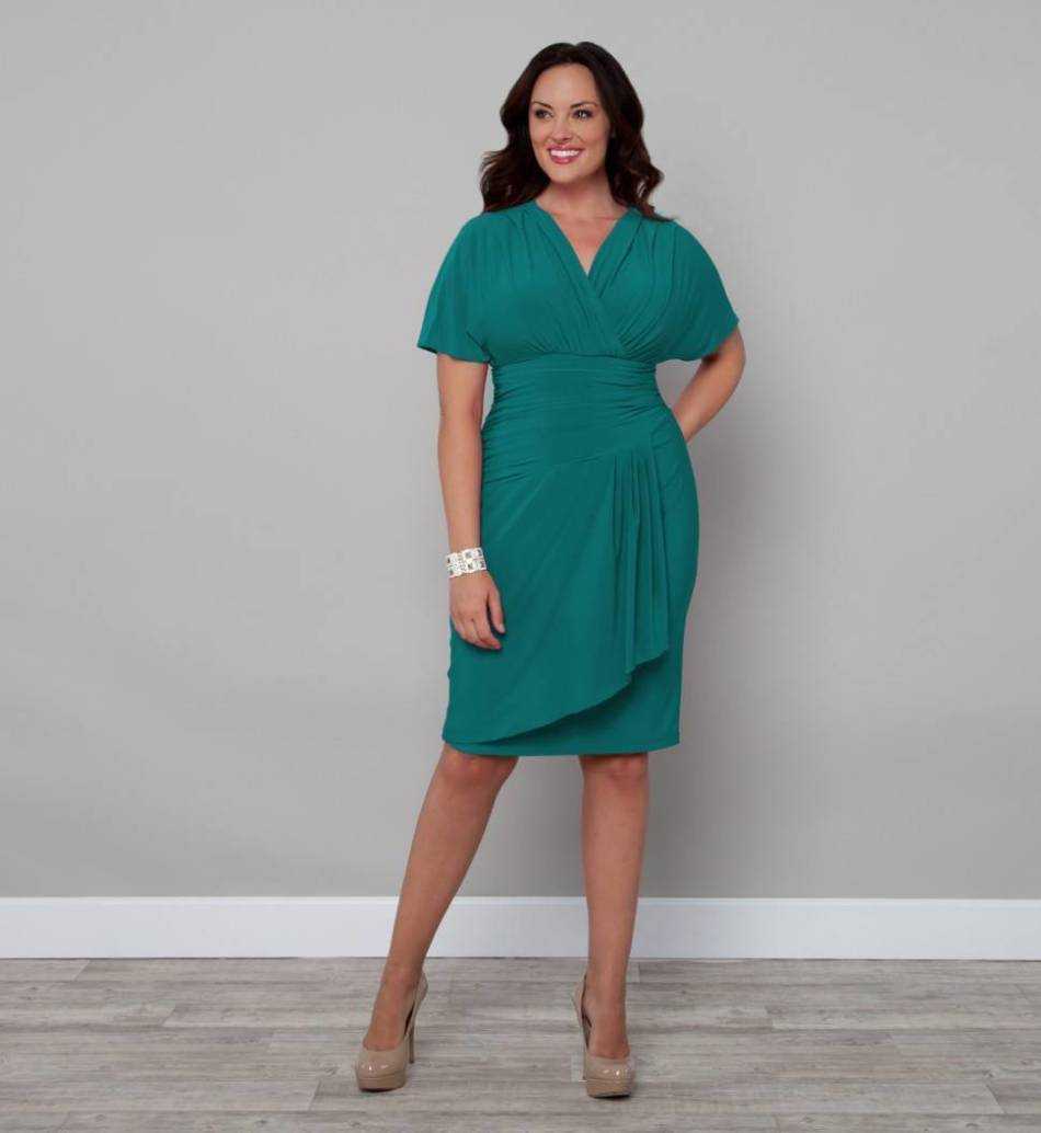 Платье, которое имеет запах, и бюст подчеркнет, и талию выделит плавно. Если вы выберите немного расклешенный вариант, то скорректируете линию бедер. Длину лучше предпочесть до колена, рукав – ¾. Ткань должна быть струящейся, например, трикотаж.